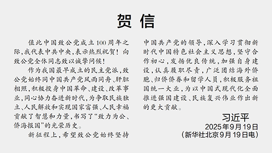 值此中国致公党成立100周年之际,我代表中共中央,表示热烈祝贺!向致公党全体同志致以诚挚问候!