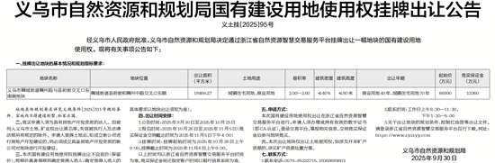 经义乌市人民政府批准,义乌市自然资源和规划局决定通过浙江省自然资源智慧交易服务平台挂牌出让一幅地块的国有建设用地使用权。现将有关事项公告如下: