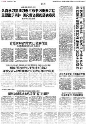 王浩强调,要把学习《习近平谈治国理政》第五卷与深入贯彻落实习近平总书记考察浙江重要讲话精神结合起来,深入践行“八八战略”,聚焦“落实”二字,紧扣高质量发展建设共同富裕示范区这一核心任务,坚定不移扛起“经济大省挑大梁”的责任担当,保持经济运行稳中有进、向新向好的良好态势;坚定不移加快建设创新浙江、因地制宜发展新质生产力,着力构建浙江特色现代化产业体系;坚定不移推进高水平对外开放、建设高能级开放强省;坚定不移以“千万工程”牵引城乡融合发展缩小“三大差距”;坚定不移深化文化建设“八项工程”,加快建设高水平文化强省;坚定不移建设更高水平生态省、打造美丽浙江;坚定不移打造新时代党建高地和清廉建设高地,一步一个脚印把习近平总书记擘画的宏伟蓝图变为美好现实。