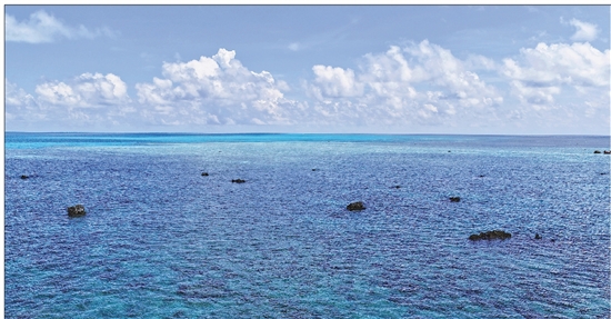 10月2日拍摄的黄岩岛礁盘露出水面的礁石。