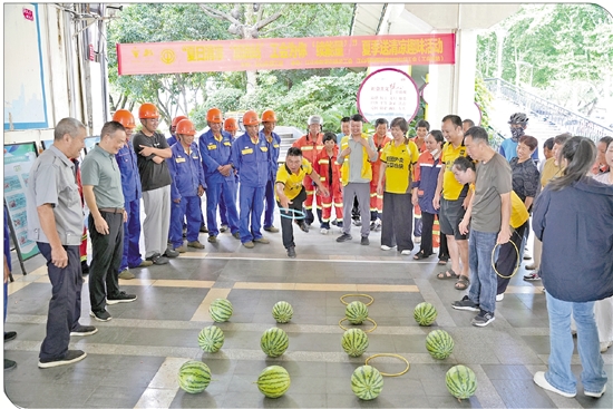 2025年7月11日,由江山市总工会主办、江山市双塔街道总工会承办的夏季送清凉活动在江山市双塔街道书院社区工会驿站举行。图为外卖小哥参与套西瓜趣味活动。