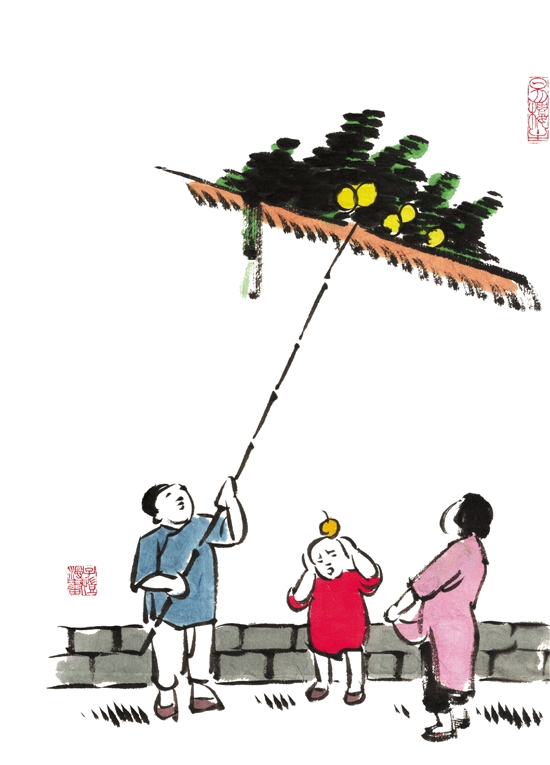 漫画《风西梨枣山园,儿童偷把长竿。莫遣旁人惊去,老夫静处闲看》。(局部)