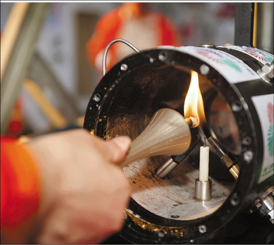 在科考船甲板面,工作人员从搭载在潜水器上的采火装置里取火。 新华社记者 卢汉欣 摄