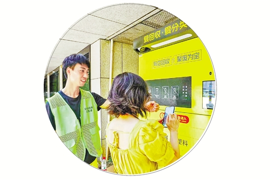在翠苑街道,居民在志愿者指导下使用爱回收智能回收机。