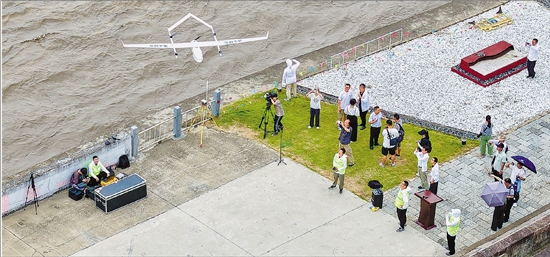 科考队操控无人机升空,开启科学探测。 本报记者 王志杰 摄