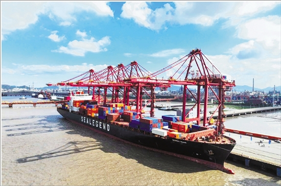 “伊斯坦布尔桥”轮在宁波舟山港装载,全球首条中欧北极集装箱快航开通。 向恋梅 摄