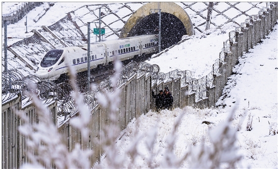 10月15日,乌鲁木齐迎来秋后首场降雪。图为民警对辖区线路隧道出入口进行安全巡查。 新华社发(叶帅 摄)