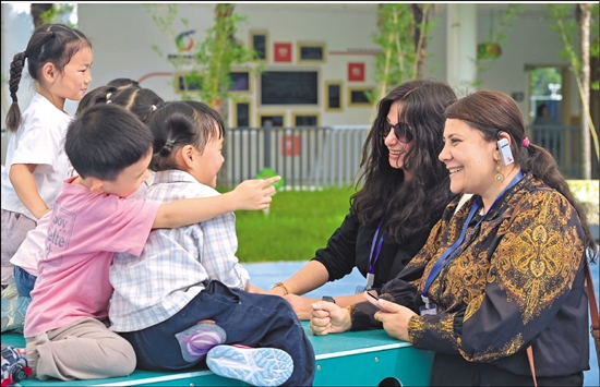 在安吉灵峰中心幼儿园,学员们与中国儿童亲切互动。