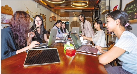 社区内的共享书房、餐厅成了女性数字游民办公、交流的场所。