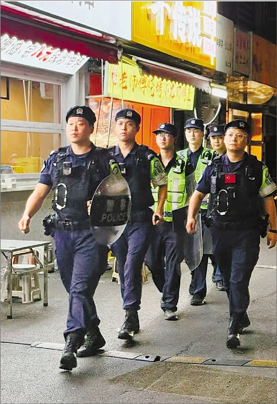 轻装PTU队员带着小区保安巡逻。 本报记者 王逸群 摄