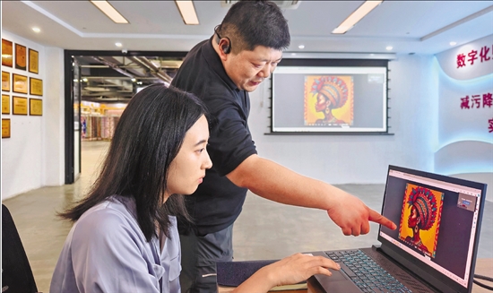 记者(左)尝试用AI布设计花型。 本报记者 金汉青 摄