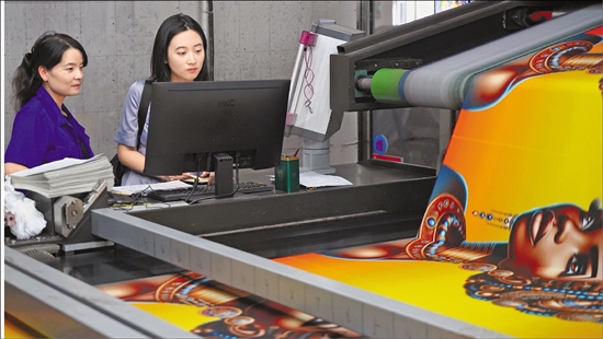 记者(右)观摩车间印染。 本报记者 金汉青 摄