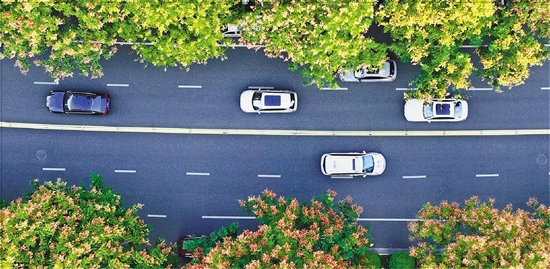 在杭州市上城区凯旋路两侧,400余株黄山栾树的枝头正呈现“绿、黄、红”三色同框的鲜活景致。