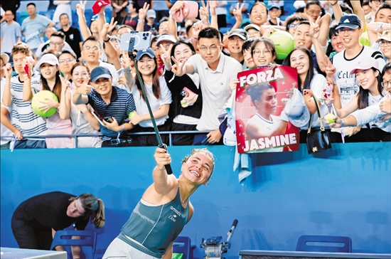 宁波网球公开赛现场,意大利球员保利尼与支持她的球迷一起欢乐合影。