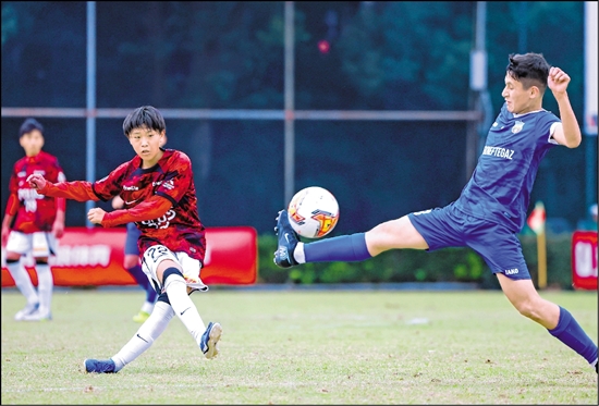 “钱潮杯”国际青少年足球邀请赛现场,球员角逐绿茵场。
