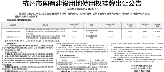 六、挂牌竞买申请。参加挂牌竞买的竞买申请人可在2025年11月17日9∶00至2025年11月26日17∶00登录浙江省自然资源智慧交易服务平台(www.zjzrzyjy.com)进行报名。竞买申请人须按照挂牌出让须知要求办理数字证书并足额交纳竞买保证金或提交足额银行保函,符合竞买要求方可参加网上挂牌出让活动。