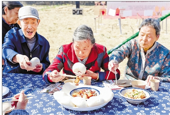 老人们在长桌宴上品尝“钦堂八大碗”。