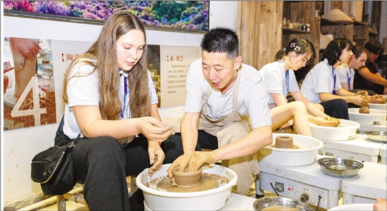 外国游客在武义坛头村体验婺州窑制作。 共享联盟·武义 陈俊 摄