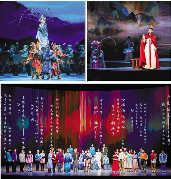 上左图:婺剧《三打白骨精》现场表演片段。上右图:越剧《我的大观园》现场表演片段。下图:话剧《北上》现场表演片段。 均为主办方供图