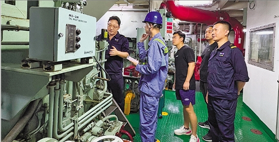 船员为记者(左二)介绍巡检工作。 通讯员 邵梦园 摄