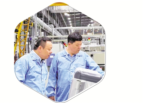 焱唐能源科技(杭州)有限责任公司车间内,企业人员向建行客户经理介绍产品工艺。