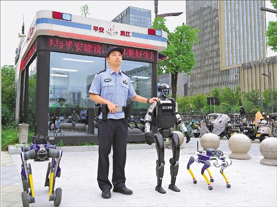 由机器人、机器狗等组成的滨江公安“滨江机警”战队,与民警共同执勤。