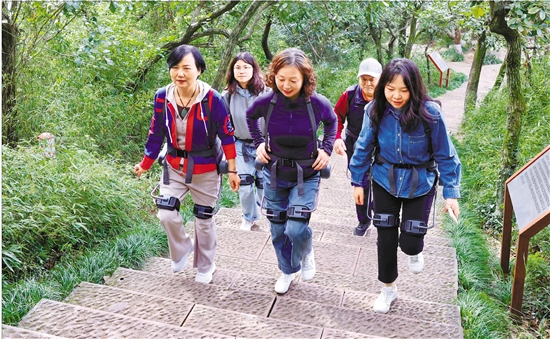 记者(前排右)与初次体验外骨骼的老人们一起登山。 本报记者 周逸 摄