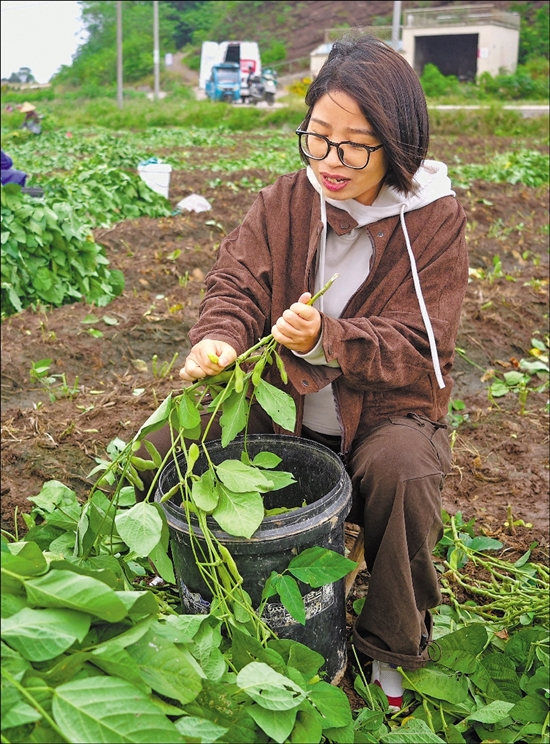 记者梅玲玲摘毛豆豆荚。本报记者 林霄 摄