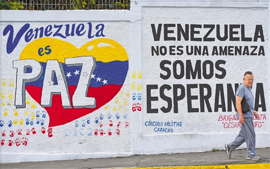 9月22日,在委内瑞拉首都加拉加斯,行人从街头的宣传标语前走过。标语上写着“委内瑞拉是和平国度”“委内瑞拉不是威胁,而是希望”。 新华社发(马科斯·萨尔加多 摄)