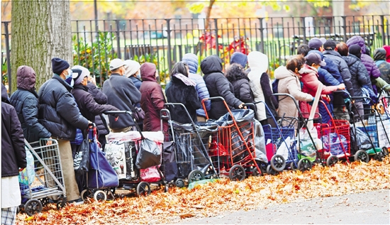 11月12日,在美国纽约皇后区纽约食物银行一处发放点,人们排起长队,在寒风中等待领取食品和日用品。 新华社记者 张凤国 摄