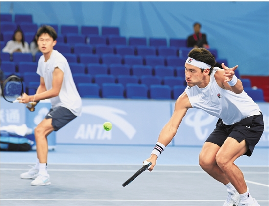 11月18日,在网球男子双打半决赛中,浙江队3号种子组合布云朝克特/郑展击败头号种子曾姚杰/杨子江闯入决赛。图为郑展(左)、布云朝克特在比赛中。 本报特派记者 王建龙 董旭明 摄