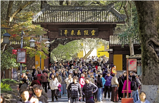 图为11月19日,络绎不绝的游客排队进入灵隐飞来峰景区游玩。 本报记者 林云龙 摄