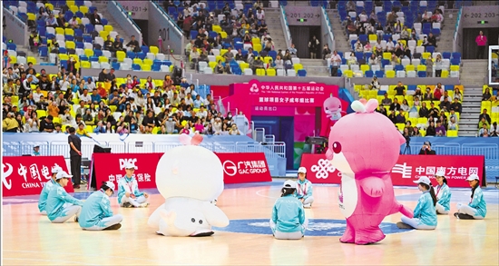 “喜洋洋”与“乐融融”(右四)在全运会比赛间隙为观众表演节目。 新华社发