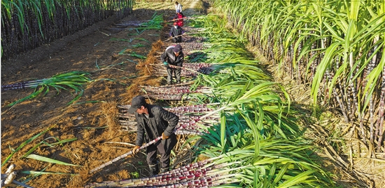 11月20日,在建德市航头镇航川村,种植大户王有昌组织村民采收红皮甘蔗。种植甘蔗在航头镇有着悠久历史,一般亩产在2000根至3000根左右,经济效益可观。
