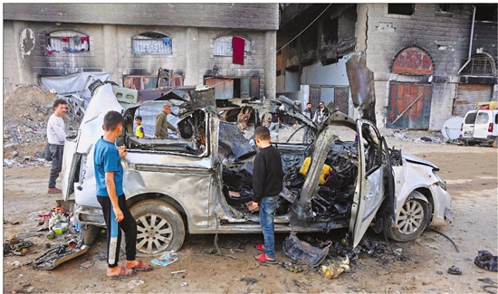 11月22日,在加沙地带北部加沙城,人们查看被以色列空袭炸毁的汽车。 新华社/法新