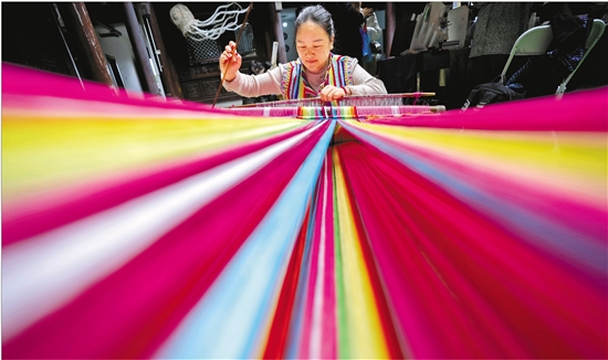 11月23日,2025非遗品牌推广周启动仪式在云南省大理市举行。本次推广周集中展示了来自全国各地富有特色、具有较高知名度和影响力的120余家非遗品牌。图为独龙毯制作技艺展台的工作人员在推广周上制作独龙毯。