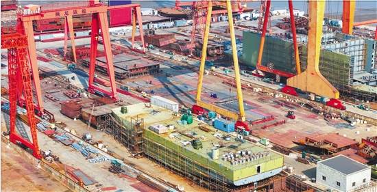 日前,温岭市松门镇腾龙造船厂内,工人们正在热火朝天建造科考船。这艘由30多名渔民集资建造的科考船,目前已实现,预计将于2026年初建成。图为已合拢的底层船体。