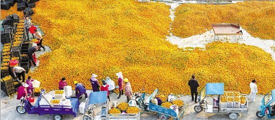 当前正值三门柑橘上市旺季,各地客商前来收购,帮助果农实现就地销售。图为三门县浦坝港镇圩岙村的收购现场,果农们忙着交易。