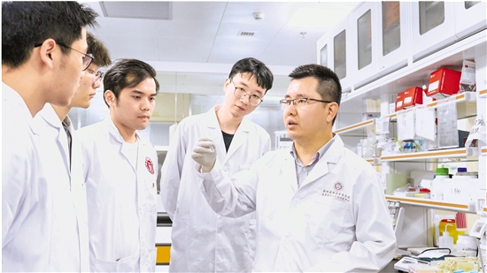 温医大博导王周光(右一)带着学生在实验室。 受访者供图