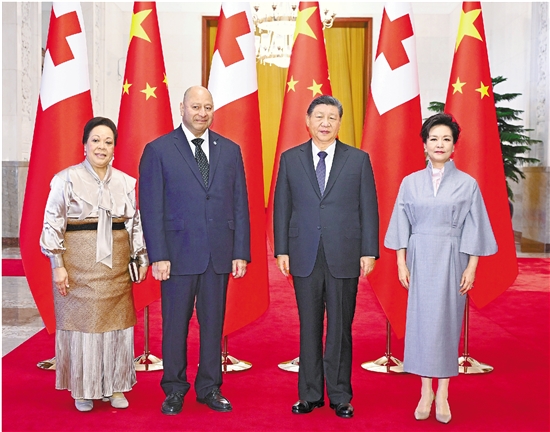 11月25日上午,国家主席习近平在北京人民大会堂会见来华进行国事访问的汤加国王图普六世。这是习近平和夫人彭丽媛同图普六世和王后娜娜茜帕乌合影。 新华社记者 燕雁 摄