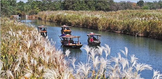 11月28日,杭城天气晴好,西溪湿地“秋芦飞雪”景观吸引了众多游人。游客泛舟芦荡,感受西溪的生态人文之美。