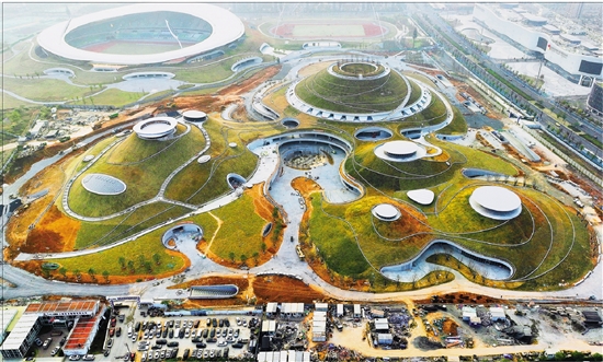 衢州市体育中心“三馆”外立面草皮铺设基本完成。 受访单位供图