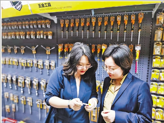 一米供应链工作人员向建行义乌分行工作人员介绍出口商品。