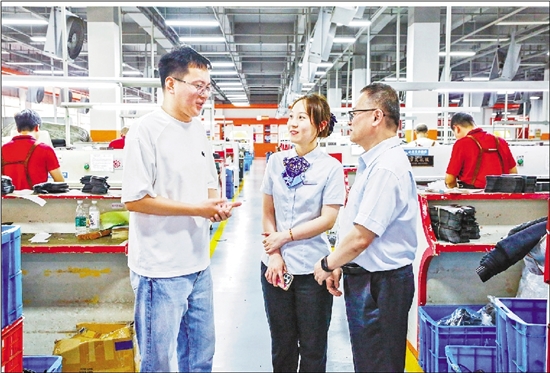 建行温州永嘉支行客户经理走进浙江奥康鞋业股份有限公司,了解企业产品外销情况及金融需求。