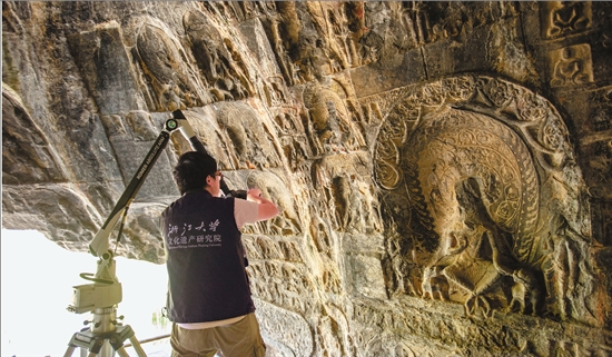 浙江大学艺术与考古图像数据实验室学生在龙门石窟古阳洞进行三维激光扫描。 本版图片均由受访者提供