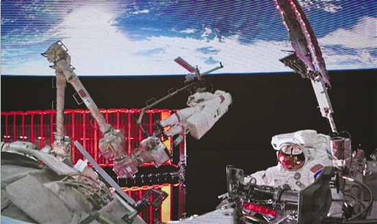 这是12月9日在北京航天飞行控制中心屏幕上拍摄的神舟二十一号乘组航天员张陆与武飞(右)在舱外工作的画面。 新华社记者 刘艺 摄