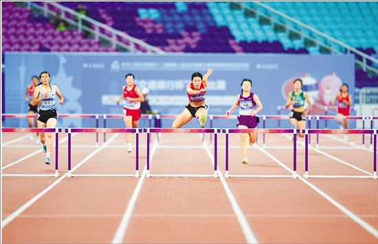 陈玥洁(中)在田径女子听障400米栏决赛中。 本报记者 彭鹏 摄
