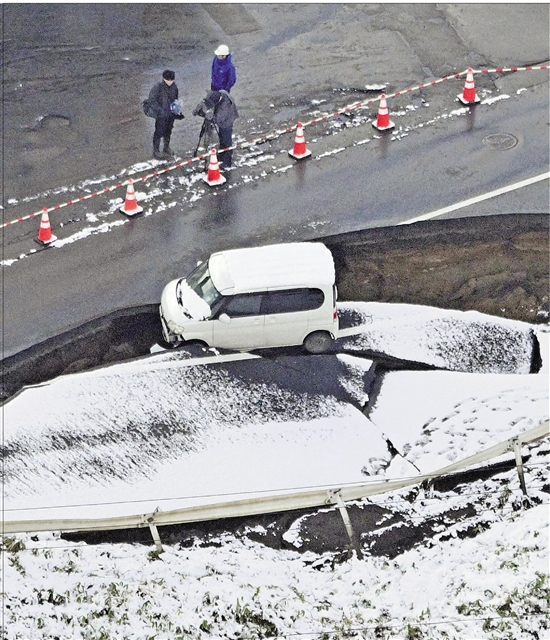 这是12月9日在日本青森县东北市航拍的一辆停在塌陷路面上的车辆。
