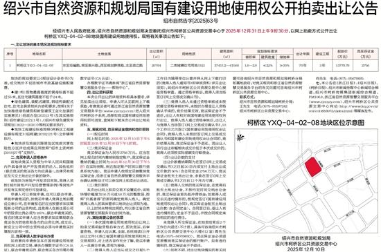 经绍兴市人民政府批准,绍兴市自然资源和规划局决定委托绍兴市柯桥区公共资源交易中心于2025年12月31日上午9时30分,以网上拍卖方式公开出让柯桥区YXQ-04-02-08地块国有建设用地使用权。现将有关事项公告如下: