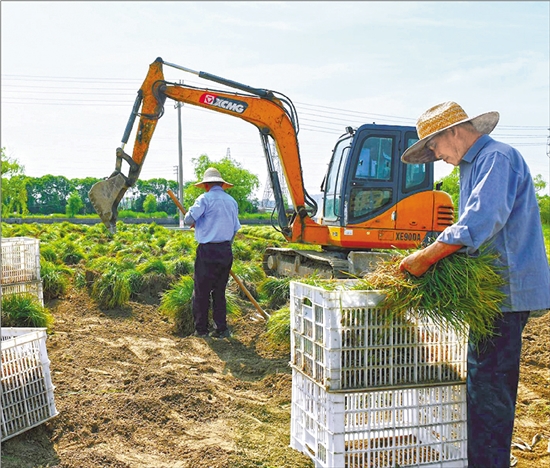 今年5月,产业工人在崇寿镇浙麦冬特色产业园里,运用机械化设备进行采收。